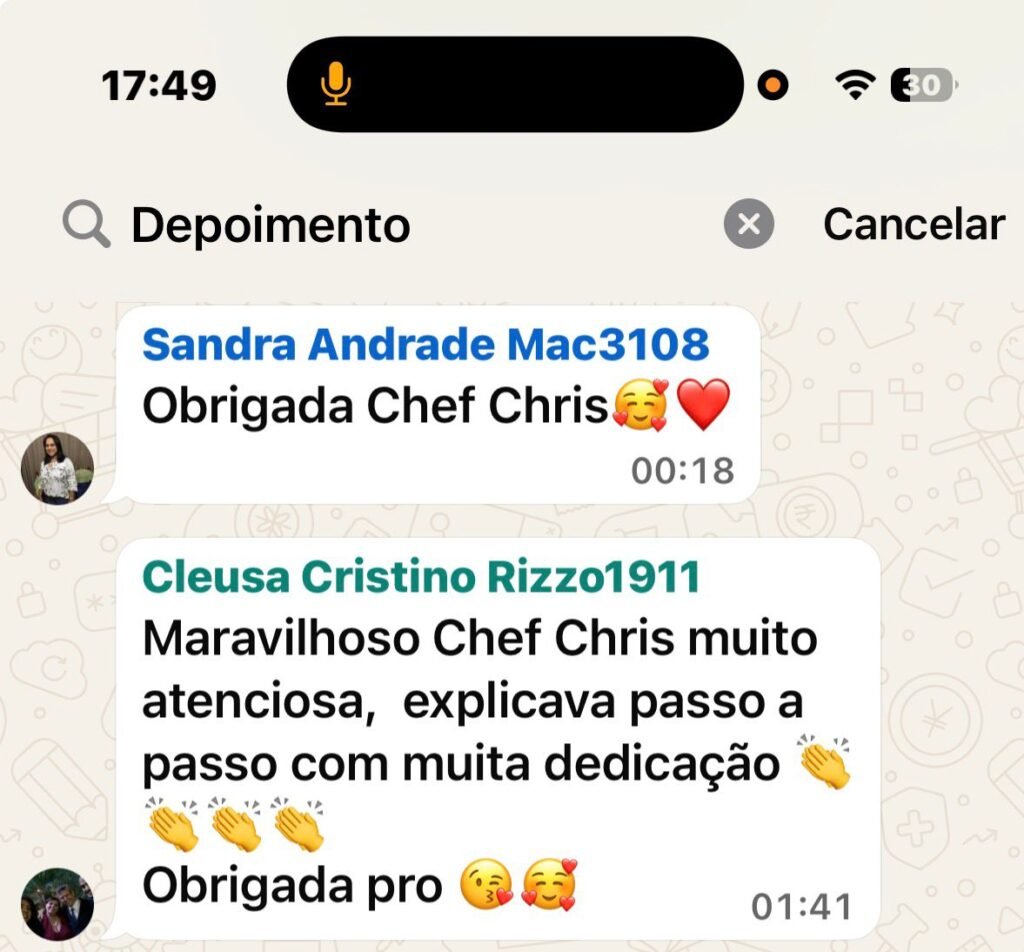 Sim, é ao vivo — e você pode interagir com a Chef em tempo real. Mas se não conseguir assistir no dia, não tem problema! A gravação ficará disponível por 30 dias para você rever e praticar com calma.